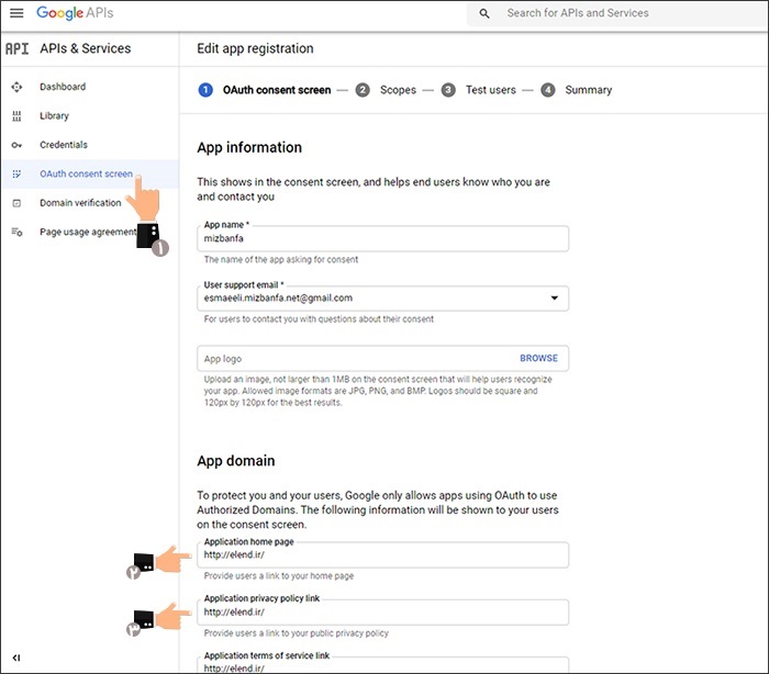 - Application name: در این فیلد نام سایت خود را وارد کنید. این نام در صفحه ای که از کاربر اجازه اتصال به اکانت گوگل با سایت درخواست می شود، نمایش داده می شود.